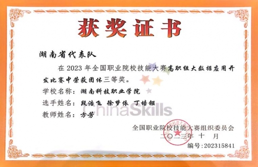 10月23日,2023年全国职业院校技能大赛高职组大数据应用开发赛项在海南省琼海市南海博物馆举行,来自全国各省和直辖市的64支代表队参赛。该赛项首次采用师生同赛赛制,人工智能学院方芳老师和段浩飞、徐梦依、丁培镪三名同学组成的参赛队伍,经过8个小时激烈比拼,荣获该赛项三等奖。