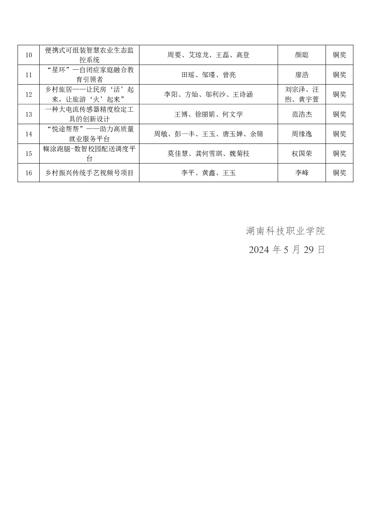 关于公布 2024 年湖南科技职业学院大学生创新创业大赛获奖名单的通知