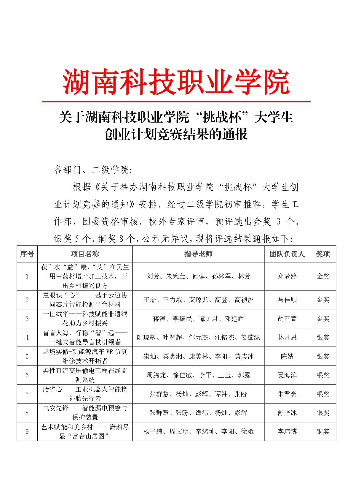 关于湖南科技职业学院“挑战杯”大学生创业计划竞赛结果的通报