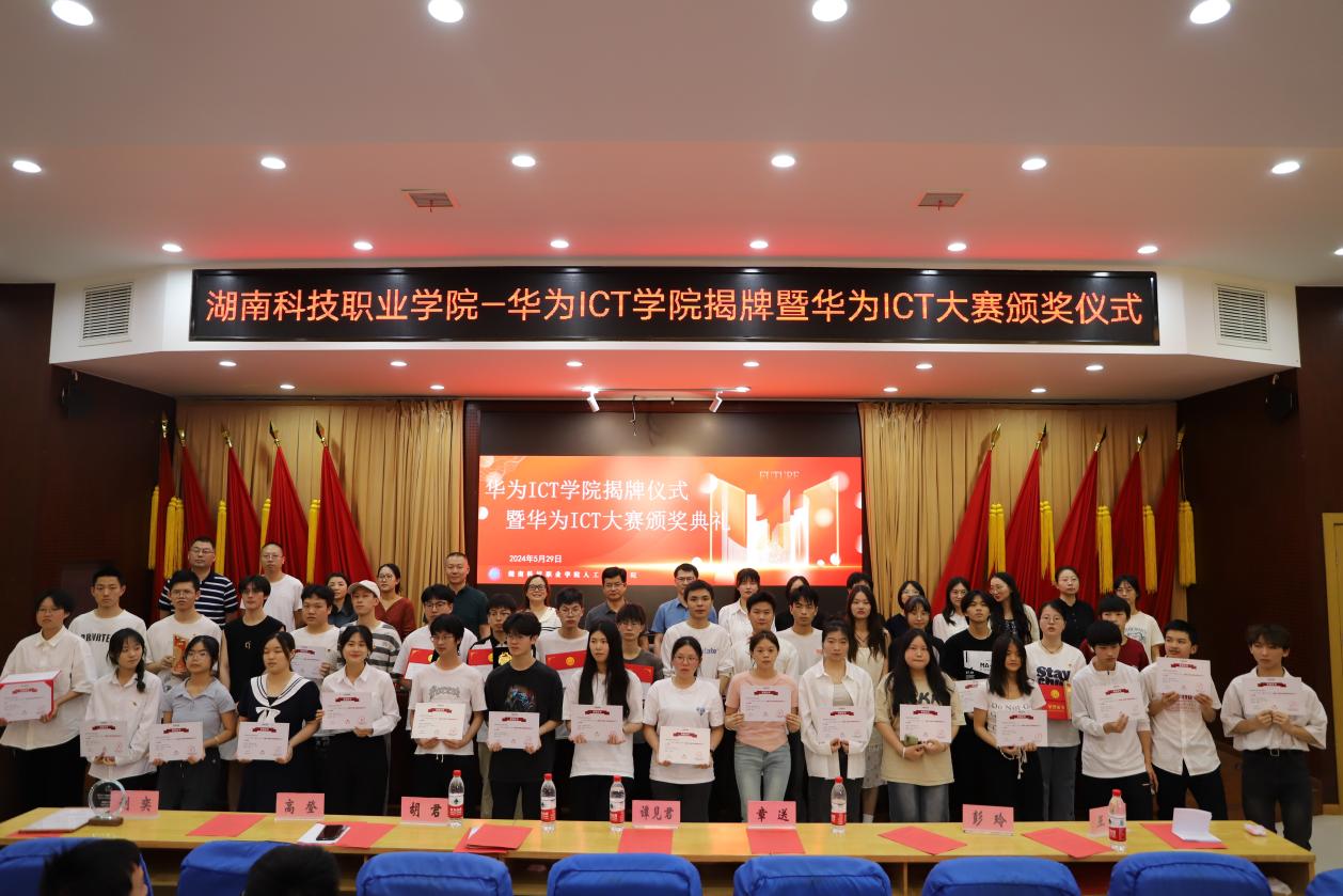 揭牌仪式后,校企双方为2023-2024华为ICT大赛获奖学生及指导老师颁奖。人工智能学院在本次大赛中共获全球赛二等奖1项,全国赛一等奖1项、二等奖2项、三等奖1项,省赛特等奖1项、二等奖4项、三等奖6项,获奖等级和获奖数创历史新高。这些获奖学生在比赛中展现出了卓越的技术水平和创新能力,是学院ICT人才培养成果的杰出代表。