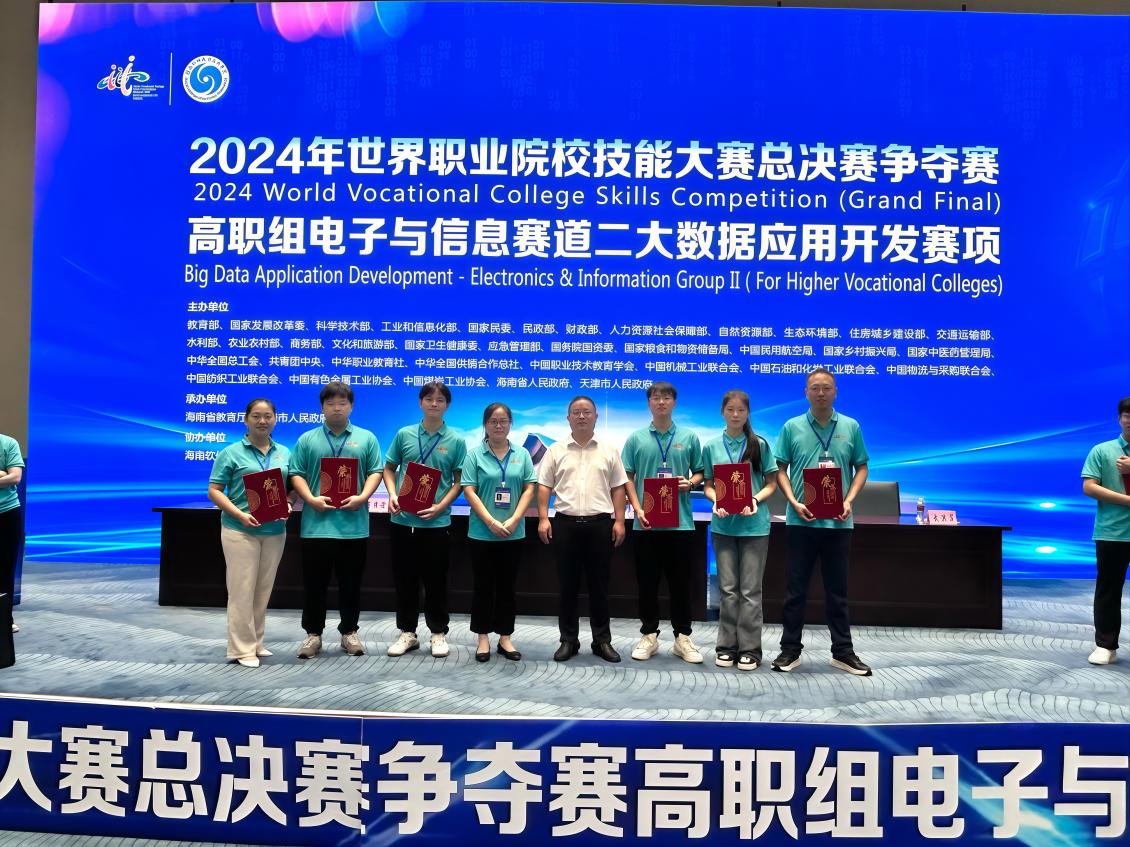 10月26日至29日,2024年世界职业院校技能大赛总决赛争夺赛高职组大数据应用开发赛项在中国海南南海博物馆开赛。来自全国30个省、自治区、直辖市和新疆生产建设兵团的61支代表队同台竞技。经过紧张激烈角逐,我院大数据技术专业周志化、廖珂带领的蒋杨彬、邹勤辉、文嘉仪、李荣慧以优异成绩勇夺奖。