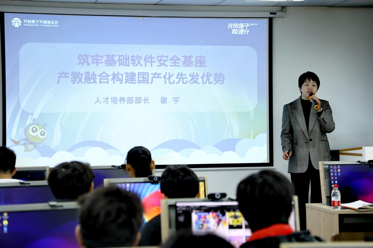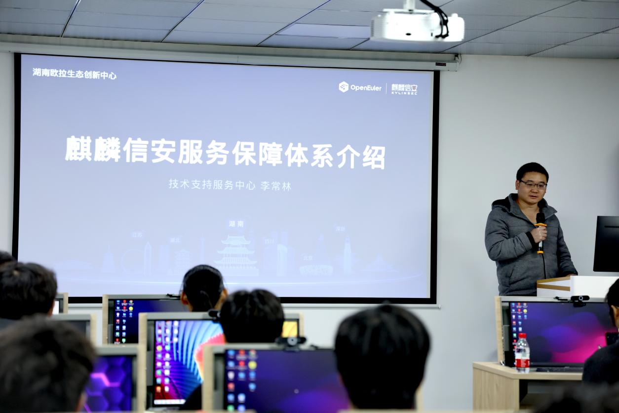 欧拉创新中心人才培养部部长谢宇为同学们详细介绍了信创中心在人才培养和产教融合等方面做的工作及取得的经验。麒麟信安技术支持服务中心、测试部项目部门负责人分别向同学们介绍了各自部门的业务情况和发展前景。在这节富有教育意义的信创课上,主讲人的互动问题激发了同学们的热情,同学们纷纷踊跃参与课堂并积极回答问题,并收到了创新中心奖励的精美礼品 。