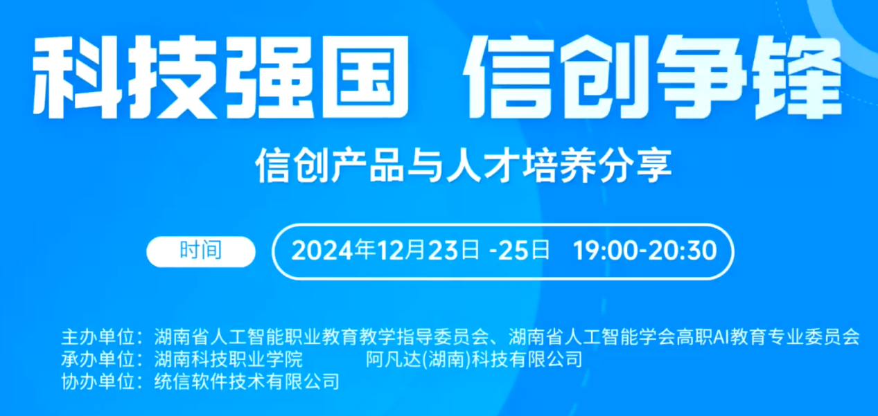 12月23日-12月25日,一场由湖南省人工智能职业教育教学指导委员会、湖南省人工智能学会高职AI教育专业委员会主办,湖南科技职业学院、阿凡达(湖南)科技有限公司承办,统信软件技术有限公司协办的以“科技强国,信创争锋”为主题的信创产品与人才培养培训班在云端成功举办,吸引了众多专家、学者及学生的积极参与。