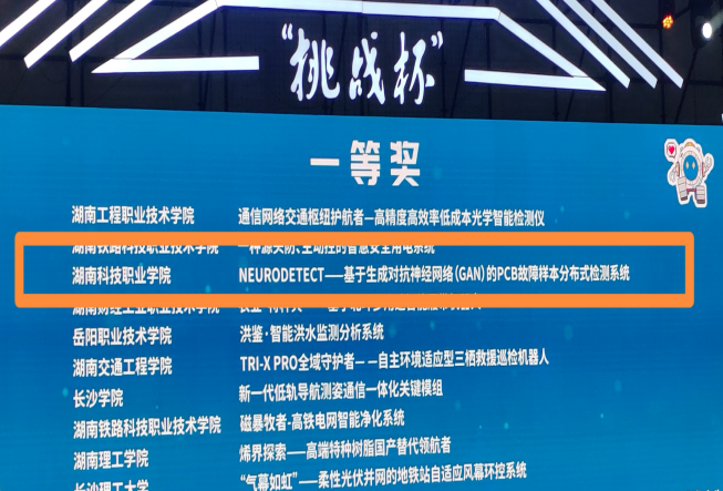 6月10日至13日,第十六届“挑战杯”湖南省大学生课外学术科技作品竞赛在邵阳学院火热开赛。在这场被誉为大学生科技创新“奥林匹克”的盛会中,人工智能学院王磊老师带领嵌入式技术应用(服务机器人方向)专业刘永辉、人工智能技术应用专业李坤乾、移动互联应用技术专业陈康等同学组成的团队,凭借“NeuroDetect-抗神经网络(GAN)的PCB故障样本分布式检测系统”项目,从全省百余所高校、400多支参赛队伍中脱颖而出,一举摘得省赛一等奖桂冠,为学院在科技创新竞赛领域书写了浓墨重彩的崭新篇章。