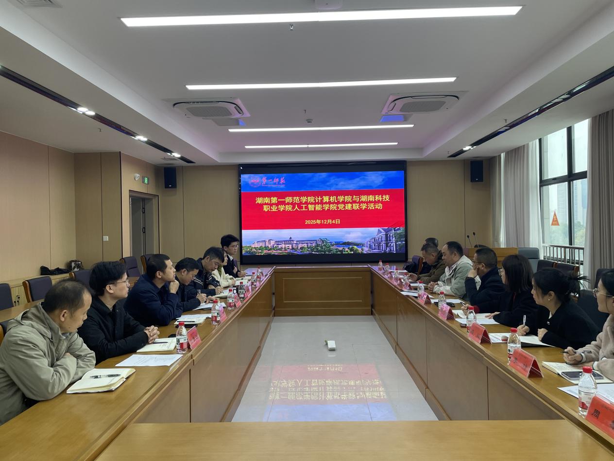 为深入学习贯彻党的二十届四中全会精神,深化校际合作交流,共探协同育人新路径,12 月 4 日上午,人工智能学院与湖南第一师范学院计算机学院在立园楼 712会议室举行党建联学活动。双方相关领导、系部负责人及骨干教师代表参会,活动由湖南第一师范学院计算机学院党委副书记陈奕主持。